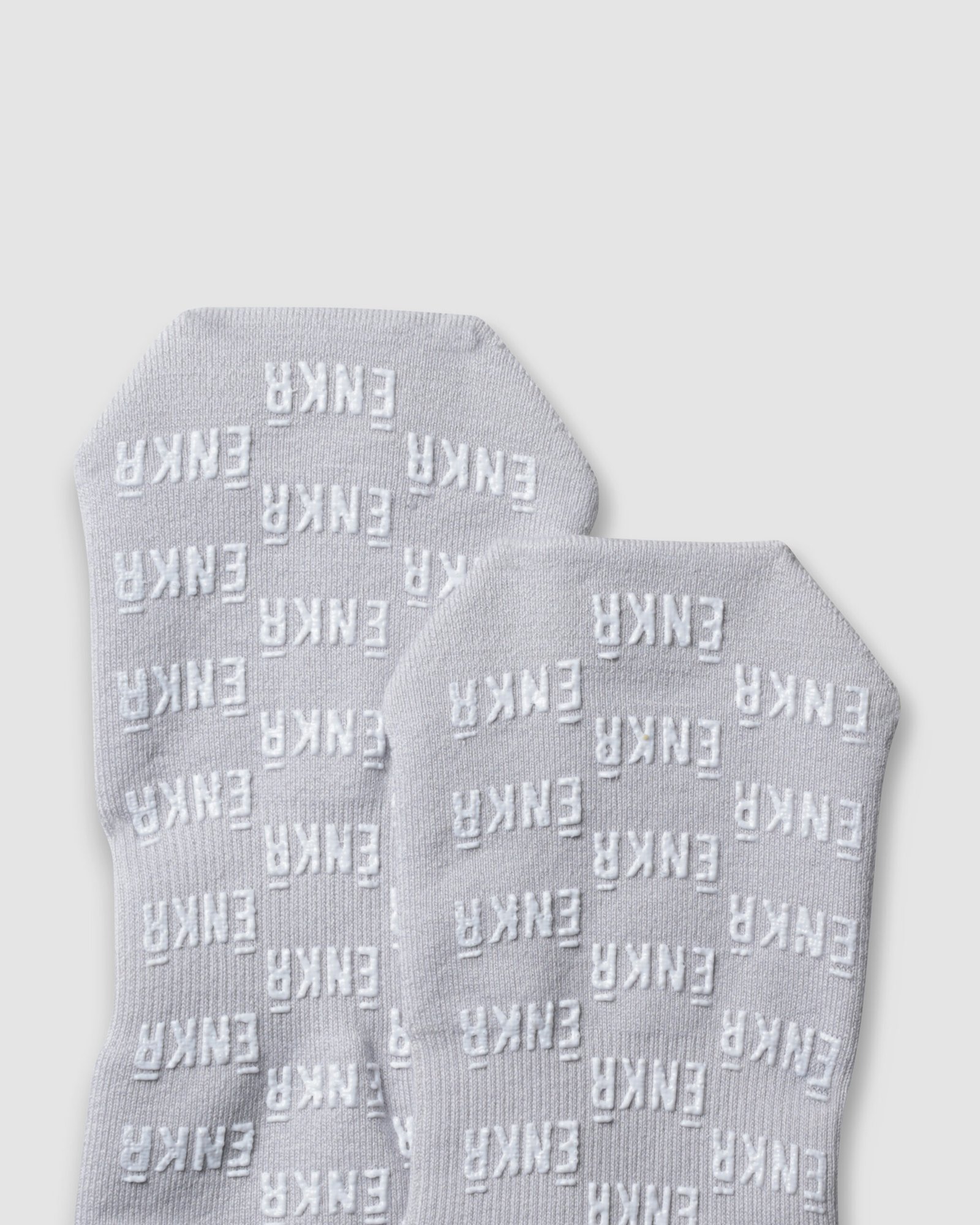 Les chaussettes ENKR intègrent des grips antidérapants en silicone, positionnés stratégiquement pour garantir une adhérence optimale sur tapis, reformer, parquet ou sol de studio.